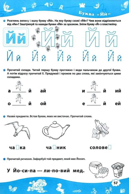 Виконуючи подані завдання, дитина вмітиме робити звуко-буквенний аналіз; вивчить букви; навчиться писати друковані літери; вмітиме читати склади, прості слова та короткі речення; розвине зв'язне мовлення, уяву, образне мислення і творчі здібності.
