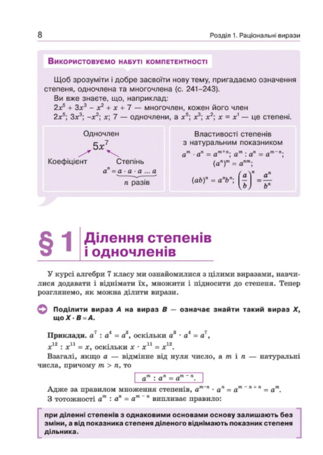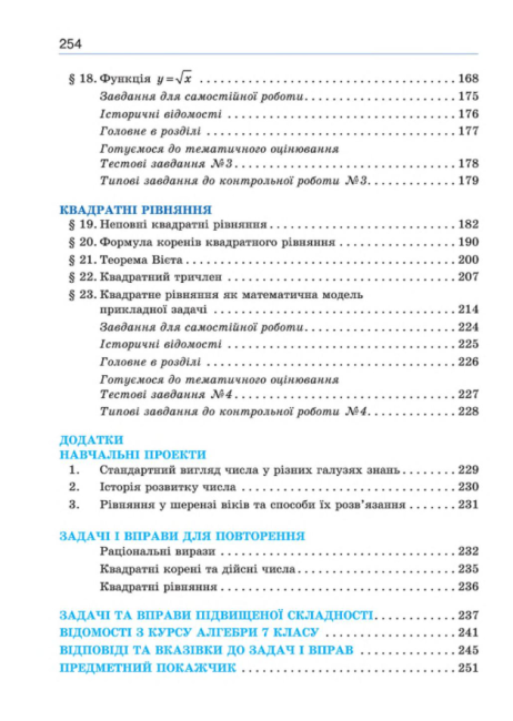 Підручник з алгебри для учнів 8 класу за Новою програмою має на меті не лише передати основні математичні знання, а й сприяти розвитку математичної та ключової компетентностей учнів, що є важливою складовою сучасної освіти. Він забезпечує всебічне формування логічного мислення та критичного підходу до розв’язання задач, створюючи умови для розвитку творчого потенціалу кожного учня. Завдяки різноманітним методам навчання, підручник реалізує розвивальний, особистісно-діяльнісний й аксіологічний підходи, які ставлять в центр уваги не лише засвоєння знань, а й формування вмінь застосовувати їх у реальному житті.