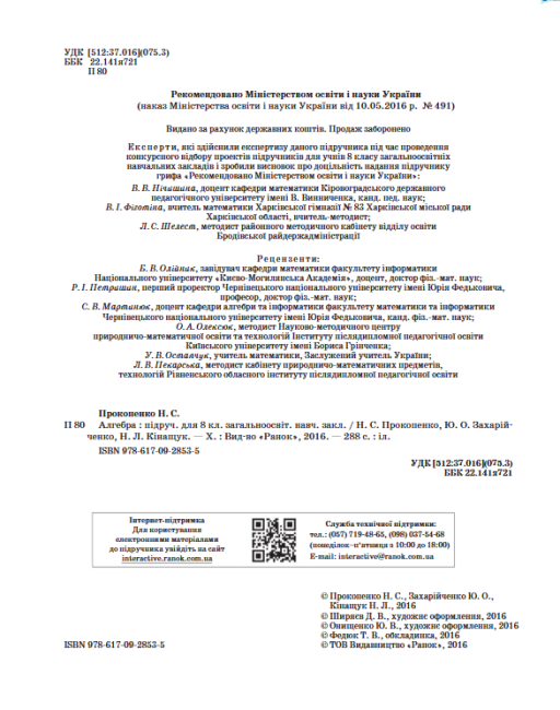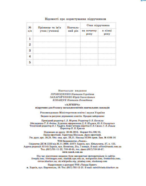 Підручник Алгебра 8 клас Нова програма Авт: Прокопенко Н. Захарійченко Ю. Кінащук Н. Вид-во: Ранок 15765