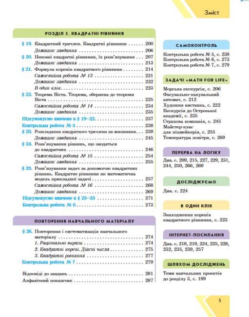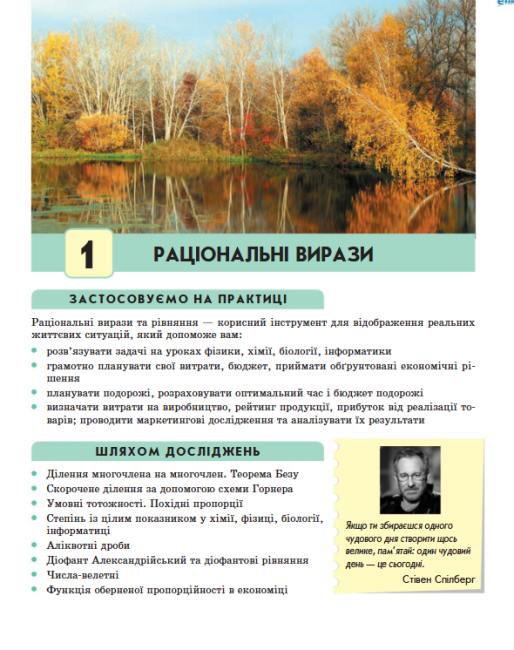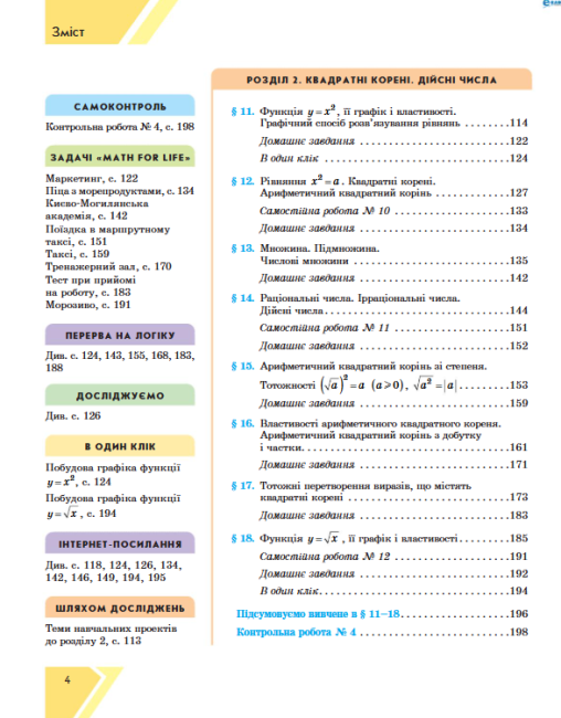 Кожен розділ підручника передбачає інтеграцію теоретичного матеріалу з практичними завданнями, що дозволяє учням краще усвідомити важливість вивченого і застосувати знання на практиці. Завдяки цьому підручник забезпечує не тільки високий рівень теоретичної підготовки, але й формує вміння застосовувати математичні знання в реальних життєвих ситуаціях.