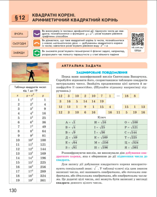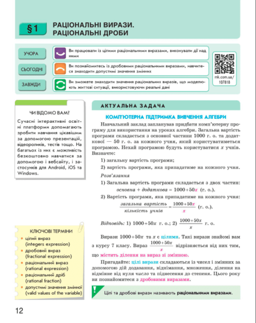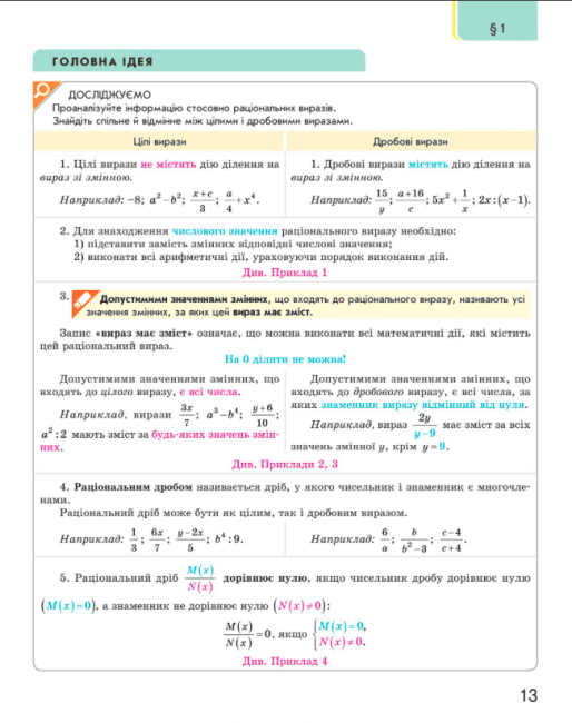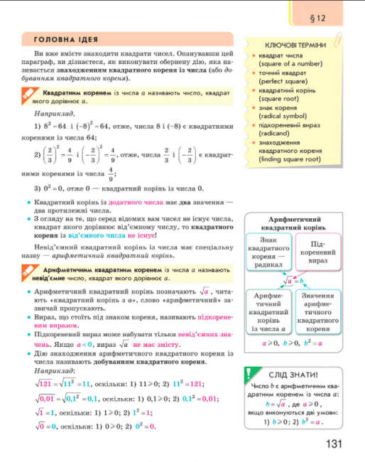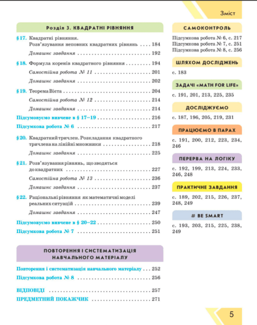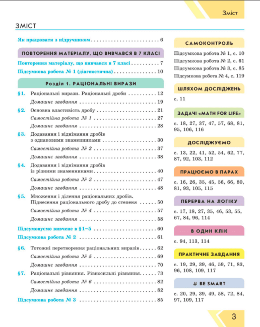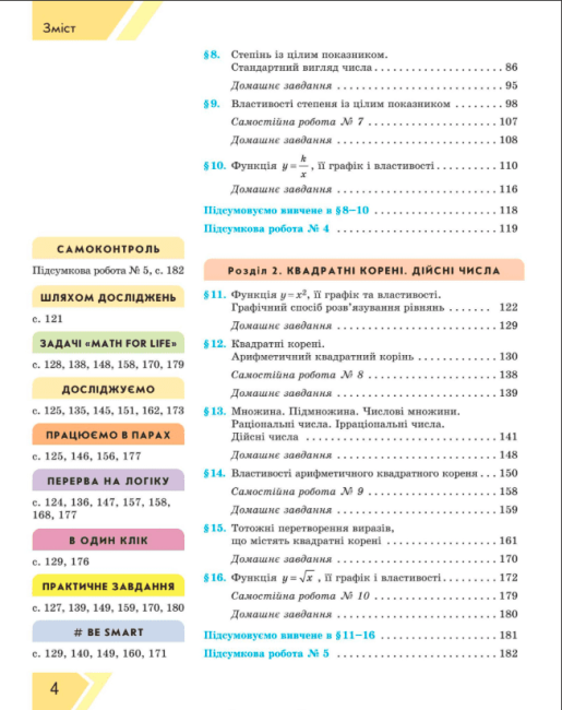 Підручник зорієнтований на формування математичного світогляду учнів і учениць. У його змісті розкриті основні алгебраїчні поняття, надані приклади застосування алгебраїчних знань у реальному житті, чіткі пояснення кожної теми з алгоритмами, опорними таблицями, мнемонічними правилами й візуалізацією для легшого запам’ятовування.