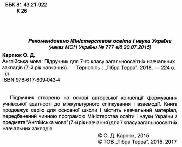 Підручник Англійська мова 7 клас Нова програма Авт: Карпюк О.Д. Вид-во: Лібра Терра 13331