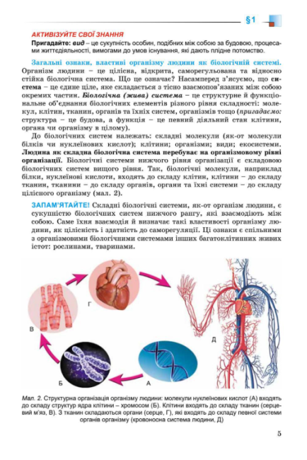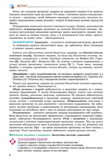 Підручник з біології для учнів 8 класу загальноосвітніх навчальних закладів, складений за Новою програмою, орієнтований на досягнення високих результатів у навчанні через компетентнісний підхід. Цей підхід передбачає не лише здобуття учнями знань з біології, а й розвиток у них предметної компетентності, яка включає в себе кілька важливих складників. По-перше, це глибокі знання з біології, що стосуються різних аспектів науки про живу природу, зокрема організму людини. По-друге, цей підручник формує у школярів позитивно ціннісне ставлення до вивчення біології, що є важливим для виховання свідомих та відповідальних громадян, здатних приймати обґрунтовані рішення на основі наукових знань.