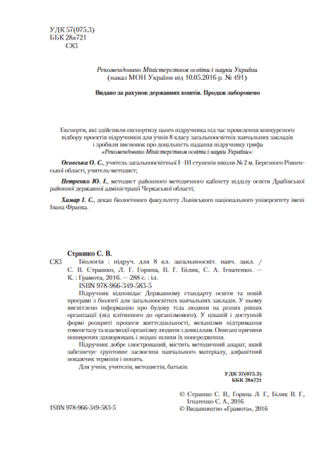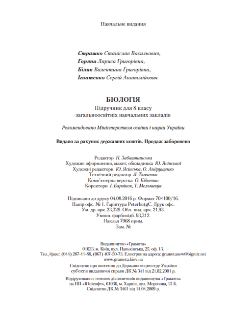 Підручник Біологія 8 клас Нова програма Авт: Страшко С. Горяна Л. Білик В. Вид-во: Грамота 16099