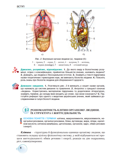 Підручник з біології для учнів 8 класу загальноосвітніх навчальних закладів, створений за Новою програмою, має на меті забезпечити учнів всебічним розумінням будови та функціонування людського організму. Він охоплює ключові аспекти біології, зокрема, надаючи глибоке уявлення про будову людського тіла на різних рівнях організації — від клітинного до організмового. Це дозволяє учням зрозуміти складні біологічні процеси та взаємозв'язки, що підтримують життєдіяльність людини.