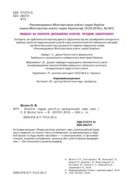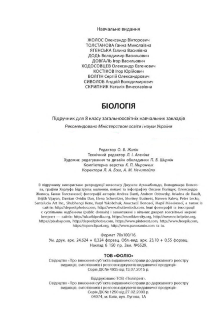 Підручник Біологія 8 клас Нова програма Авт: Жолос О. Толстанова Г. Ягенська Г. Вид-во: Освіта 15581