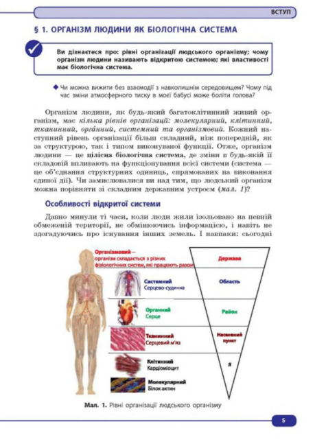 Основною ідеєю цього підручника є функціональний підхід до вивчення біології, зокрема, організму людини. У підручнику приділено особливу увагу зв’язку між будовою органів і їхніми функціями, що дозволяє учням глибше зрозуміти, як саме органи та системи організму взаємодіють для забезпечення нормального функціонування всього тіла. Кожен параграф і завдання чітко акцентують увагу на тому, як будова органів визначає їхню роль у підтримці життєдіяльності організму.