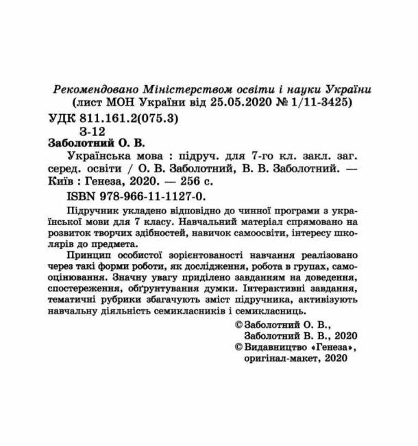Підручник Українська мова 7 клас О. Заболотного та В. Заболотного рекомендований Міністерством освіти та науки України для використання у закладах загальної середньої освіти.