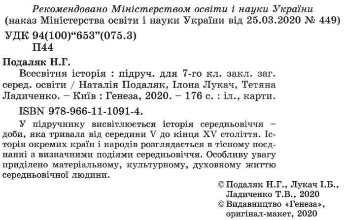 Підручник з Всесвітньої Історії. 7 клас 2020 Подаляк Н. Генеза 28882