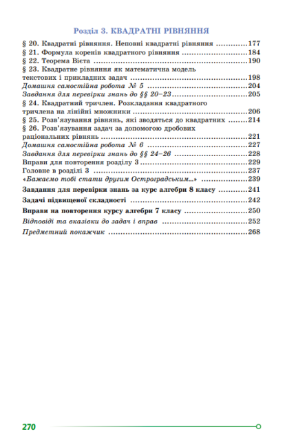 Підручник містить систематизований виклад основних розділів алгебри, що дозволяє учням поступово засвоювати матеріал, формувати математичне мислення та розвивати навички логічного аналізу. Кожен розділ містить пояснення нових понять і правил, приклади розв’язання задач, вправи для закріплення знань, а також тематичні завдання для самостійної роботи, що допомагають учням застосовувати набуті знання на практиці.