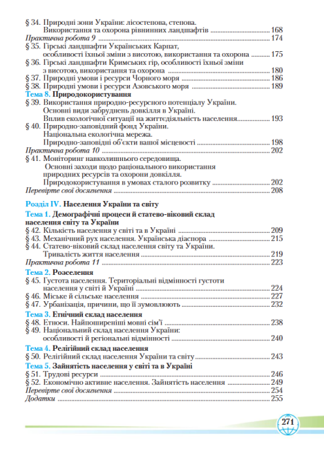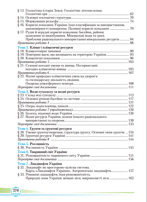 У підручнику докладно розкрито особливості природи України, закономірності розміщення природних ресурсів, специфіку господарської діяльності людини, а також подано відомості про демографічні процеси та етнічний склад населення.