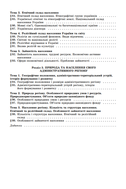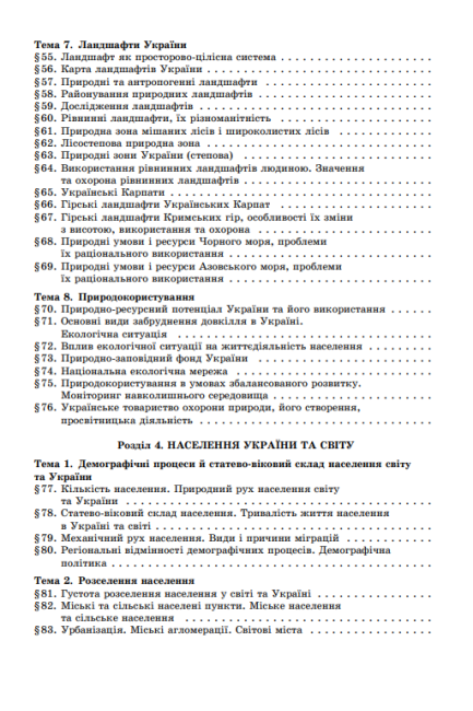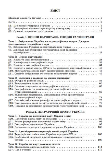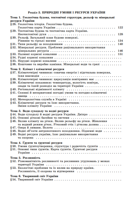 Видання охоплює поглиблене вивчення географії України, з урахуванням сучасних підходів до географічної освіти, компетентнісного навчання та розвитку просторового мислення учнів. Матеріал подано у логічній послідовності — від загальних географічних понять до вивчення природних умов, ресурсів, населення та господарства нашої держави.