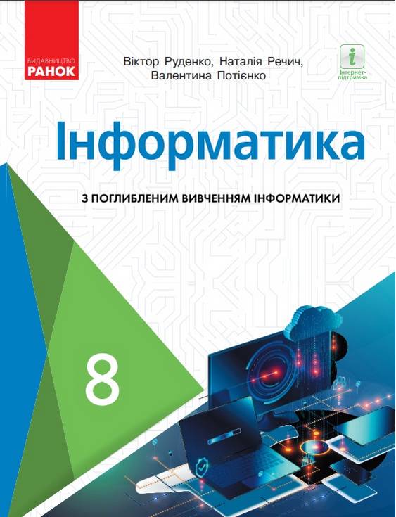 Підручник Інформатика 8 клас Програма 2021 З поглибленим вивченням Руденко В. Речич Н. Ранок. Навчальний матеріал підручника авторів Віктора Руденка, Наталії Речич, Валентини Потієнко відповідає чинній програмі з інформатики з поглибленим вивченням інформатики для загальноосвітніх навчальних закладів.