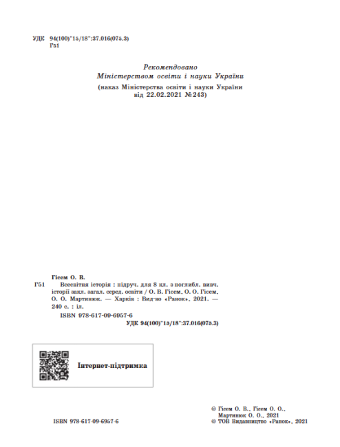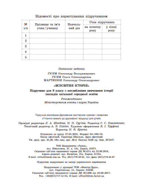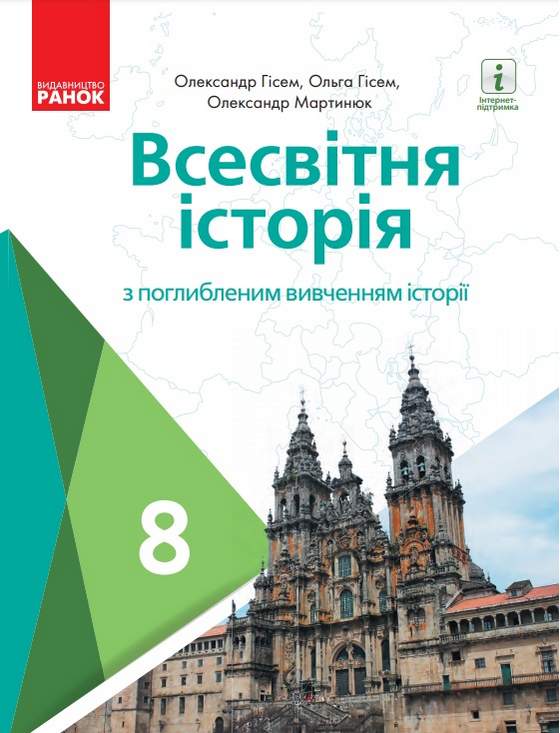 Підручник «Всесвітня історія. 8 клас (поглиблений рівень)» (автори О. Гісем, О. Мартинюк, видавництво «Ранок») створено відповідно до оновленої навчальної програми 2021 року, затвердженої Міністерством освіти і науки України.