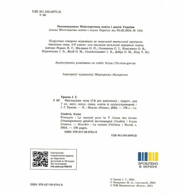 Підручник Французька мова 7 клас НУШ Авт: Ураєва І.Г. Вид-во: Ранок 101619
