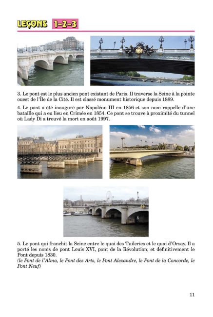 Ярко иллюстрированное издание состоит из 7 разделов, всякий из которых содержит 15 уроков, построенных по тематико-ситуативным принципу, и приложений: грамматического справочника, таблицы спряжения глаголов и французско-украинского словаря.