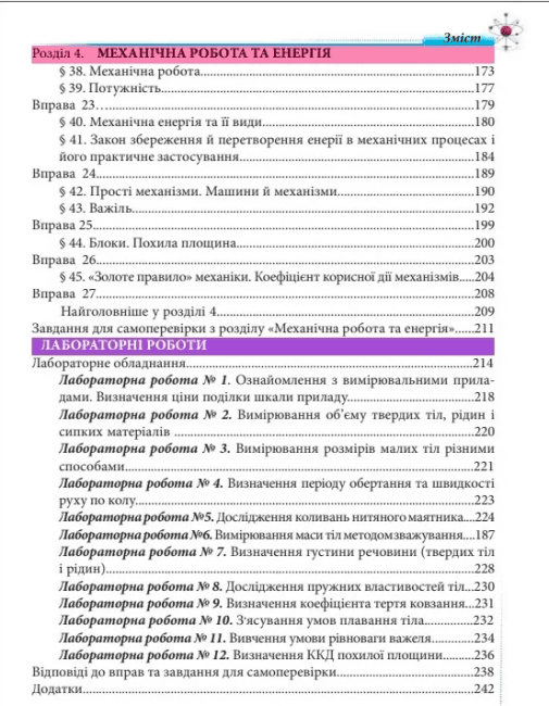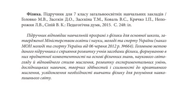 Підручник з Фізики для учнів 7 класу складено за Новою програмою. Головною метою цього підручника є сприяння розвитку учнів засобами фізики, формуванню в них предметної компетентності на основі фізичних знань, наукового світогляду й відповідного стилю мислення, розвитку експериментальних умінь, дослідницьких навичок, творчих здібностей і схильності до креативного мислення, усвідомлення необхідності вивчати фізику для розуміння навколишнього світу.