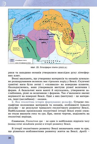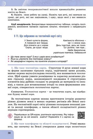 Зміст та обсяг закладеної в підручнику інформації відповідає змісту Державного стандарту середньої освіти та модельній навчальній програмі «Географія. 6—9 класи» для закладів загальної середньої освіти, автори: Запотоцький С. П., Карпюк Г. І., Гладковський Р. В., Довгань А. І., Совенко В.В., Даценко Л. М., Назаренко Т. Г., Гільберг Т. Г., Савчук І. Г., Нікитчук А. В., Яценко В. С., Довгань Г. Д., Грома В. Д., Горовий О. В. Мета підручника — формування географічних знань про природу материків та океанів, їхню цілісність і диференціацію природних умов. Водночас розширюються знання про географічну оболонку та її компоненти. Зміст курсу створює необхідну основу для розуміння учнями ролі географічної оболонки Землі в житті людей і впливу суспільства на природні умови. У підручнику містяться різні рубрики. Рубрика «Словничок» знайомить з визначеннями географічних термінів і понять, передбачених навчальною програмою. У рубриці «Україна й українці у світі» увагу акцентовано на важливих фактах про нашу країну та внесок наших співвітчизників у вивчення природи Землі. Додаткова пізнавальна інформація розміщена у рубриці «Дивовижні факти». Вона допоможе краще зрозуміти окремі питання теми, розширити інформацію про материки та океани. У кінці кожного параграфа у рубриці «Перевіряємо себе» наведено запитання і завдання, які допоможуть з’ясувати, як засвоєно навчальний матеріал, чи можуть учні та учениці аналізувати географічні явища та процеси, орієнтуватися по карті, висловлювати власна думку щодо проведених досліджень тощо. Самооцінювання в кінці кожного розділу допоможе дітям перевірити рівень сформованості компетенцій. Розвиток навичок систематичного самооцінювання буде постійним стимулом до самонавчання та бажання використовувати сформовані компетенції у повсякденному житті. Зорієнтуватися у навчальному матеріалі допоможе система умовних позначень, представлена у вступному слові підручника.