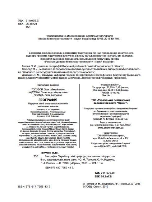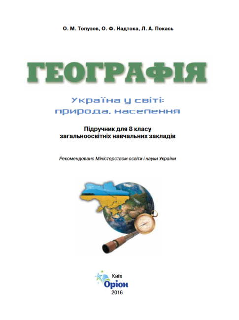 Підручник Географія 8 клас Нова програма Авт: Топузов О. Надтока О. Покась Л. Вид-во: Оріон 15829