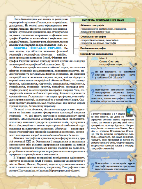 Завдання і запитання після кожного розділу допомагають учням закріплювати нові знання, розвивають їхнє логічне мислення, аналітичні та практичні навички. Крім того, підручник насичений ілюстраціями, картами, схемами, що сприяють легшому розумінню та усвідомленню географічних процесів.