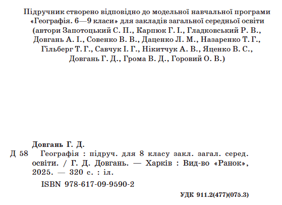 Підручник Географія 8 клас НУШ Авт: Галина Довгань Вид-во: Ранок 112044