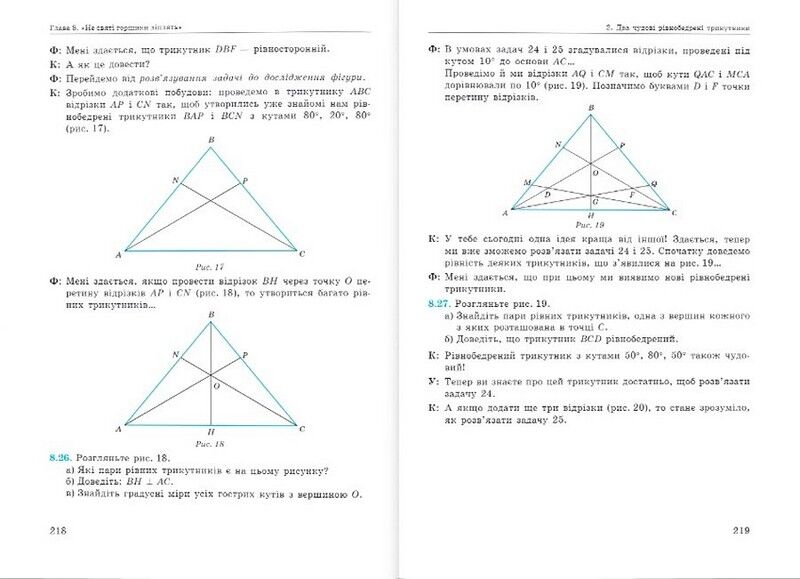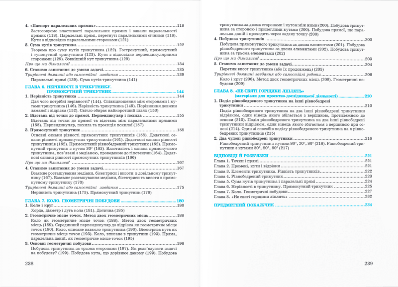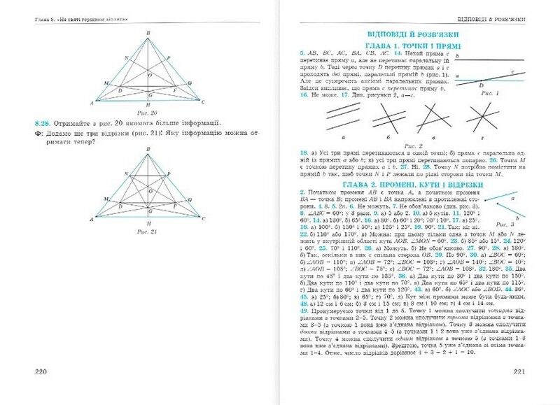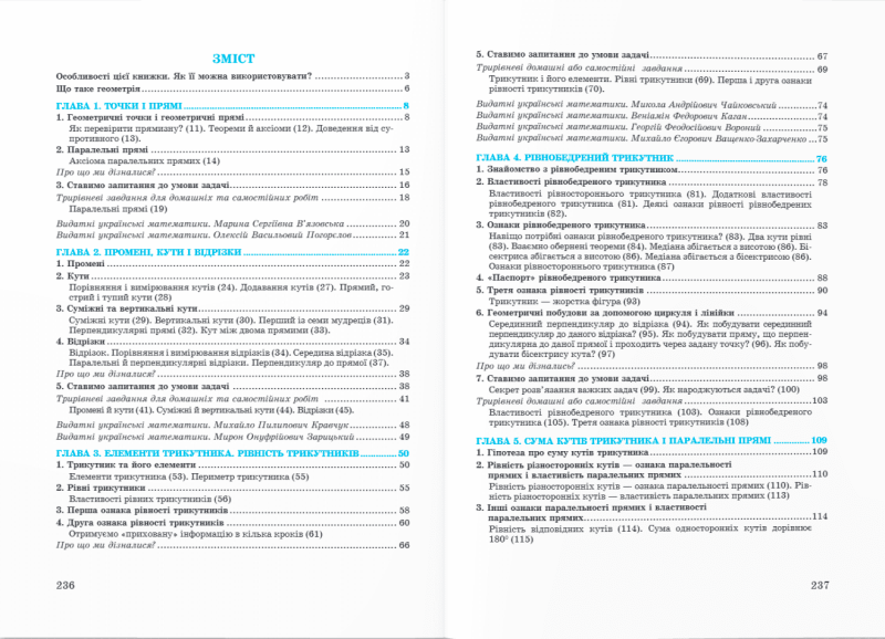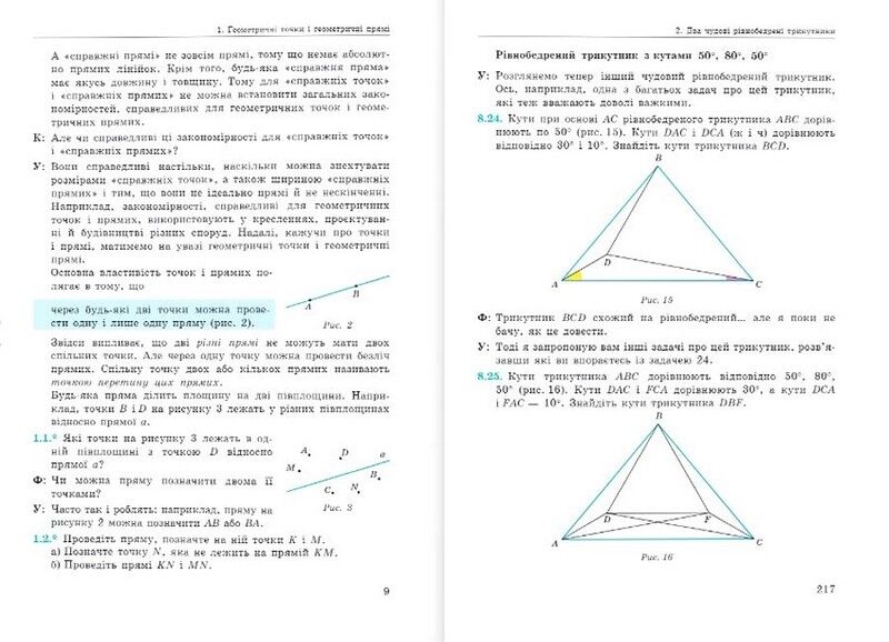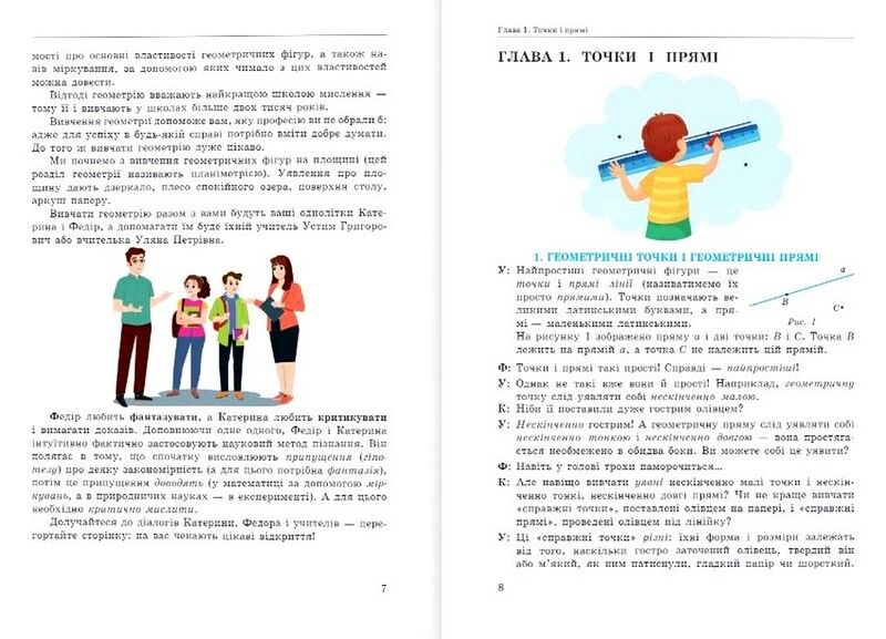 Курс геометрії 7-го класу поданий у навчальних діалогах вчителів та учнів. У ньому послідовно реалізовано дослідницький підхід до вивчення геометрії. Це значно підвищує мотивацію учнів та вчить їх розв'язувати задачі.