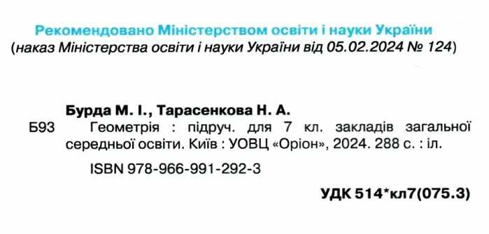 Підручник Геометрія 7 клас НУШ Авт: Бурда М.І. Тарасенкова Н.А. Вид-во: Оріон 101672