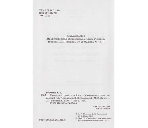 Учебник Геометрия 7 класс Новая программа Авт: Мерзляк А.Г. Полонский В.Б. Якир М.С. Изд-во: Гімназія 14281