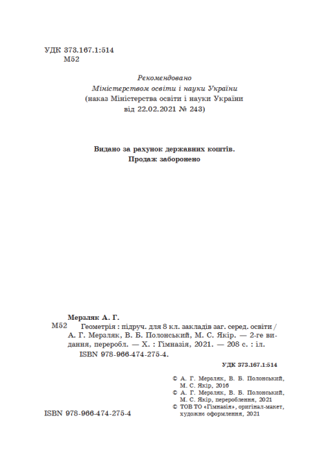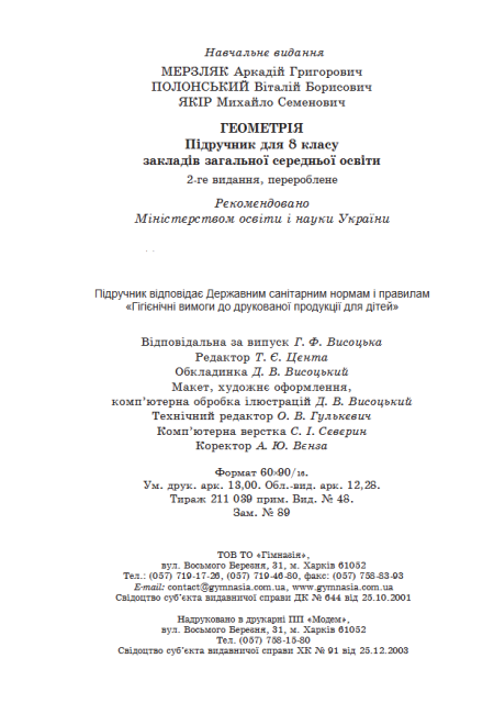 Підручник Геометрія 8 клас Програма 2021 Авт: А. Р. Мерзляк, В. Б. Полонський, М. С. Якір. Вид-во: Гімназія 96595