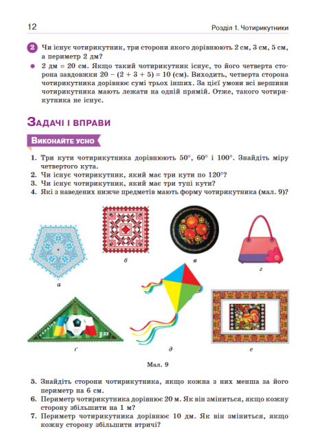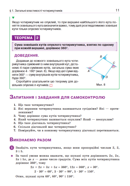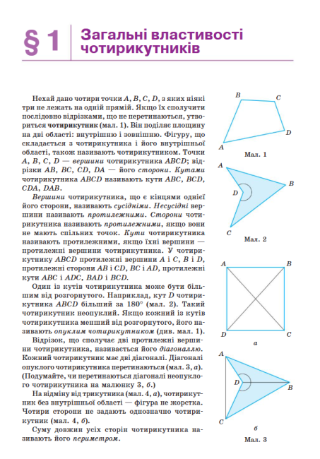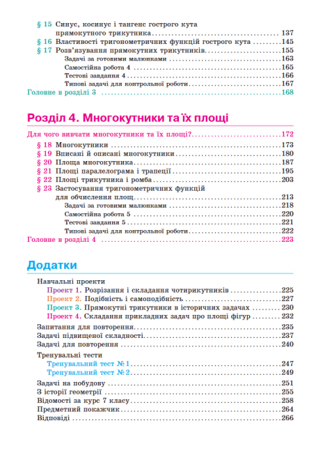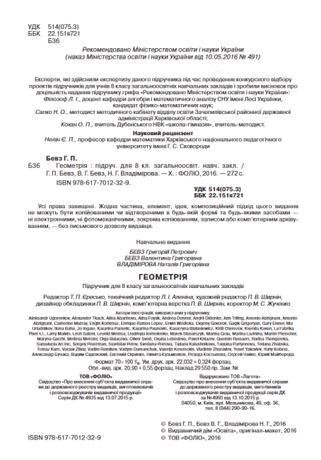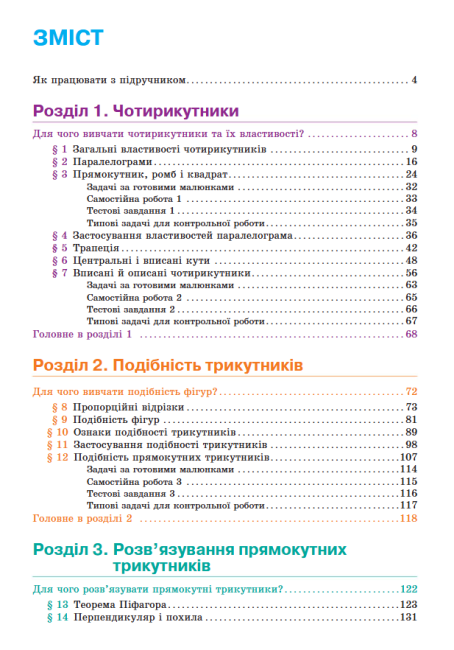 Підручник з Геометрії для учнів 8 класу складено за Новою програмою. Він побудований так, щоб навчання було цікавим, змістовним і практично орієнтованим. Кожний розділ починається з коротких відомостей про великих геометрів світу та їхніх висловлювань, які можуть стати для учнів дороговказом не лише в навчанні, а й у житті. Назви розділів і параграфів подано двома мовами – українською та англійською, що сприяє формуванню мовної компетентності та розширює кругозір школярів.