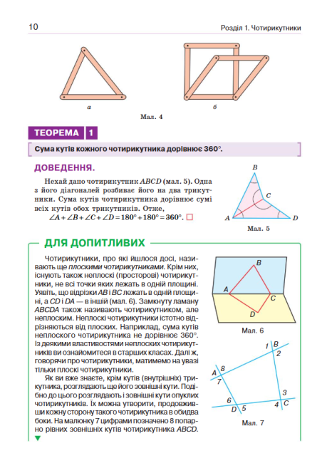 До кожного розділу включено мотиваційний матеріал, який демонструє зв’язок геометрії з навколишнім світом і різними науковими галузями, допомагає учням усвідомити практичне значення знань. Автори розробили навчальні проекти до кожного розділу, а також добірку відкритих і практичних задач, що дозволяє диференціювати навчання відповідно до рівня підготовки учнів.