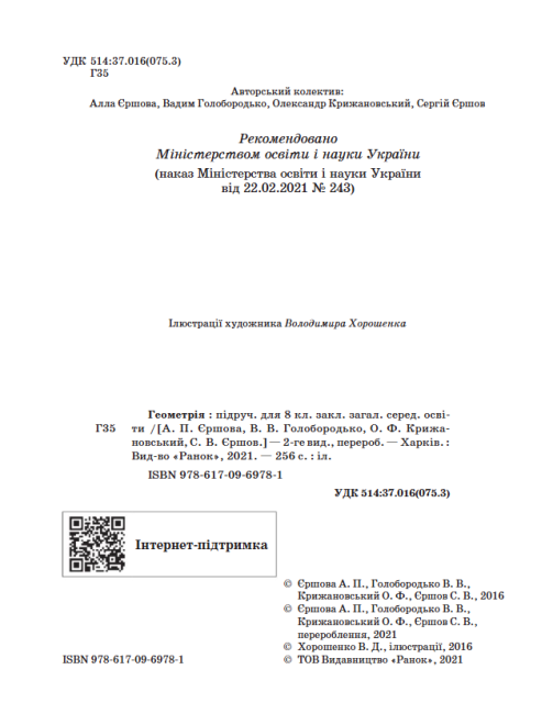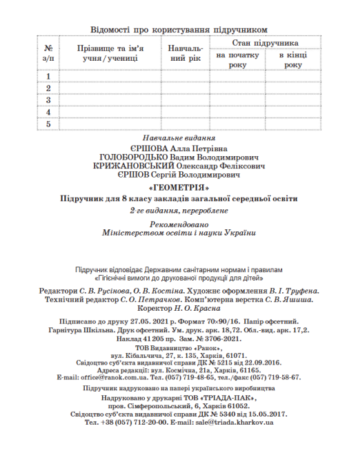 Підручник Геометрія 8 клас Програма 2021 Авт: Єршова А Голобородько В Крижановський О Вид-во: Ранок 15587