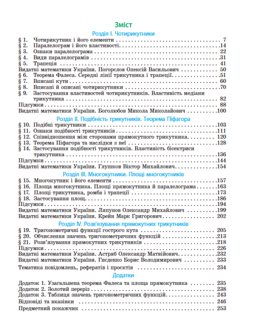 Цей підручник призначений для учнів 8 класу загальноосвітніх навчальних закладів та підготовлений відповідно до нової програми з геометрії. Він містить систематизований матеріал, що допомагає учням послідовно засвоювати основні поняття, теореми та правила геометрії, а також застосовувати їх у практичних завданнях.