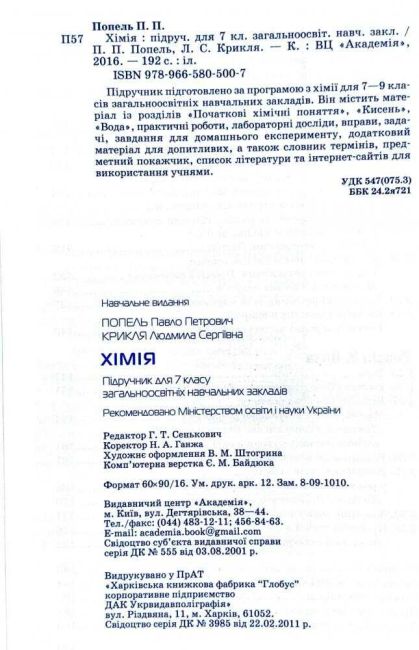 Підручник Хімія 7 клас Нова програма Авт: Попель П. Крикля Л. Вид-во: Академія