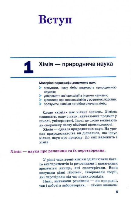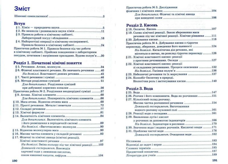 Підручник з Хімії для 7 класу загальноосвітніх навчальних закладів складено за Новою програмою. Він містить матеріал із розділів Початкові хімічні поняття, Кисень, Вода, практичні роботи, лабораторні досліди, вправи, задачі, завдання для домашнього експерименту, додатковий матеріал для допитливих, а також словник термінів, предметний покажчик, список літератури та інтернет-сайтів для використання учнями.