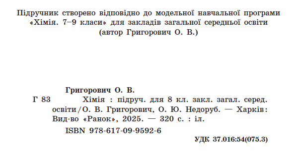 Підручник Хімія 8 клас НУШ Авт: О. Григорович О. Недоруб Вид-во: Ранок 112046