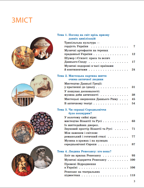 Підручник запрошує учнівство в захопливу подорож у часі – від прадавнього мистецтва до рубежу ХІХ–ХХ ст. Видання складається з 9 розділів, кожен з яких містить 4 теми з акцентом на різні види мистецтва: образотворче, музичне й театральне. Кожна тема завершується творчим проєктом, що сприяє розвитку уяви, естетичного смаку й командної роботи.