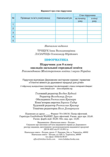 Підручник Інформатика 8 клас НУШ Авт: Інна Тріщук Олександр Лазарець Вид-во: Богдан 107284