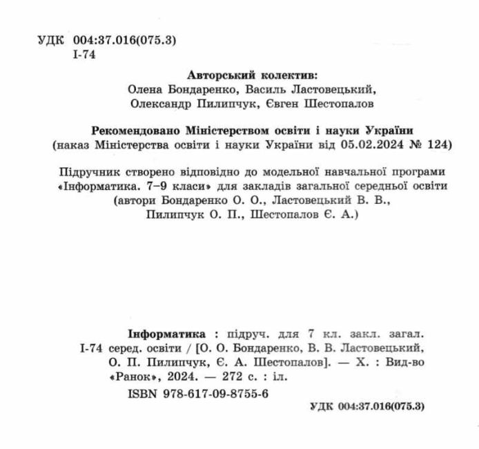 Підручник Інформатика 7 клас НУШ Авт: Бондаренко О.О. та ін. Вид-во: Ранок 101618