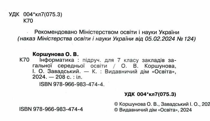 Підручник Інформатика 7 клас НУШ Авт: О.В. Коршунова І.О. Завадський Вид-во: Освіта 104339