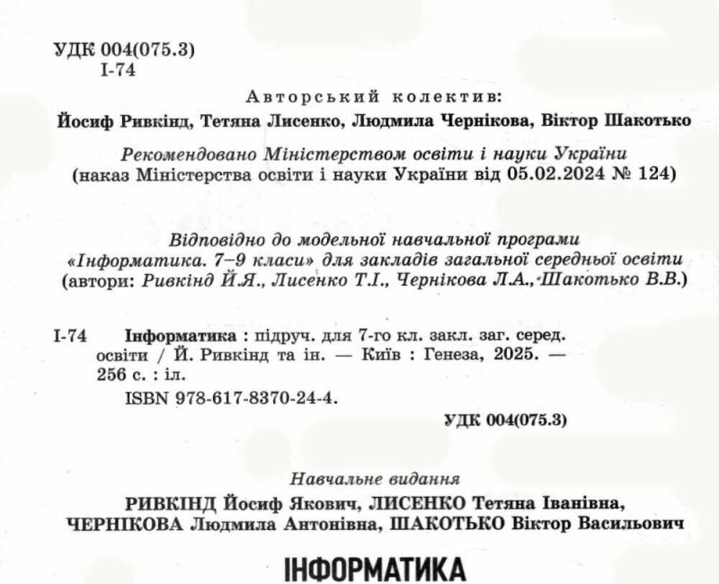 Підручник Інформатика 7 клас НУШ Авт: Ривкінд Й.Я. та ін. Вид-во: Генеза 106663