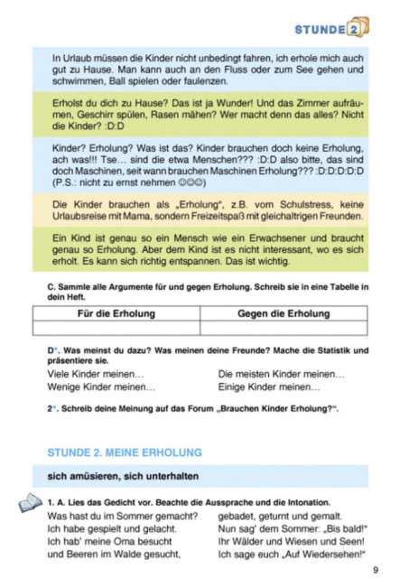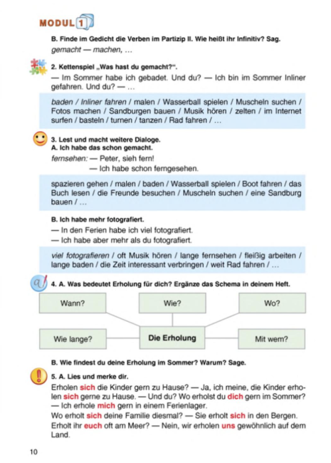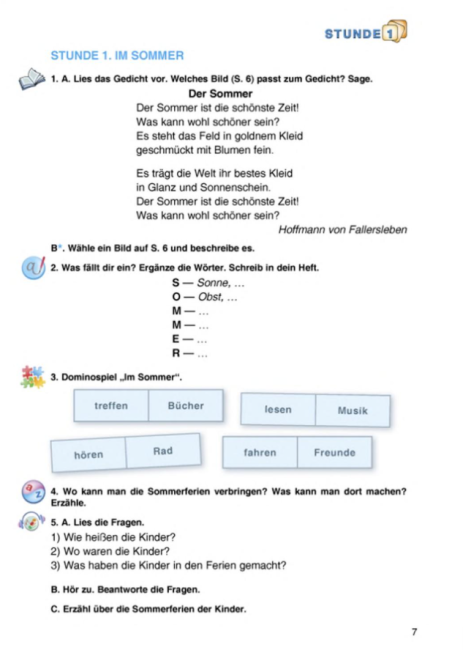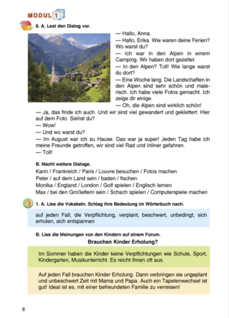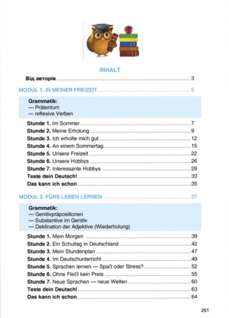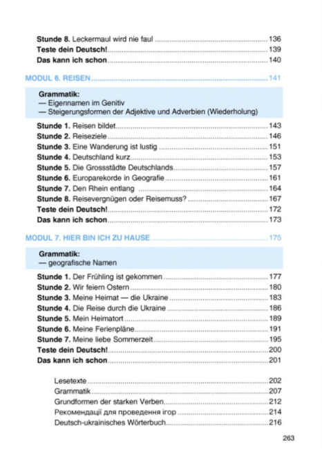 Матеріали підручника включають тексти для читання, діалоги, вправи для аудіювання, завдання для письмового та усного висловлювання, що дає змогу учням ефективно застосовувати вивчений матеріал на практиці. Підручник також підтримує розвиток комунікативної компетентності та мовної самостійності учнів, сприяє формуванню уміння правильно висловлювати думки німецькою мовою та користуватися мовою у різних соціальних ситуаціях.