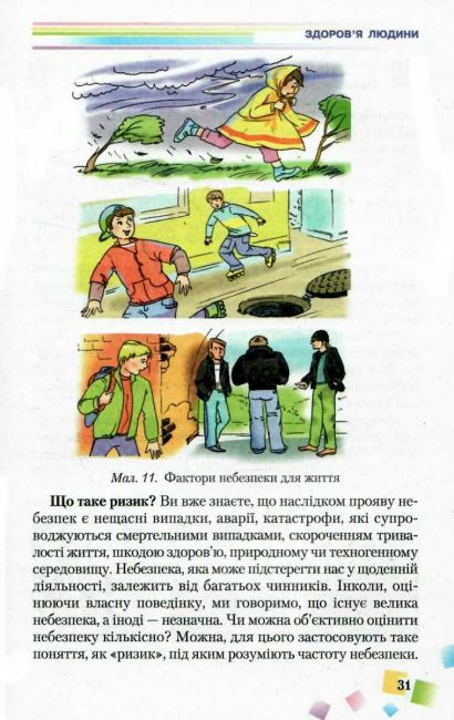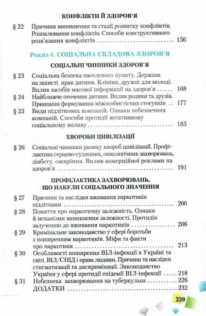Підручник укладено відповідно до Державної програми Основи здоров’я для учнів 7 класу. У ньому подано поради та рекомендації щодо формування навичок здорового способу життя, профілактики захворювань, принципів безпечної життєдіяльності та правил поведінки в небезпечних ситуаціях. Також уміщено інформацію про індивідуальний розвиток підлітків, розкрито поняття емоційне благополуччя та інші соціальні чинники здоров’я. Для учнів, учителів, методистів, батьків.