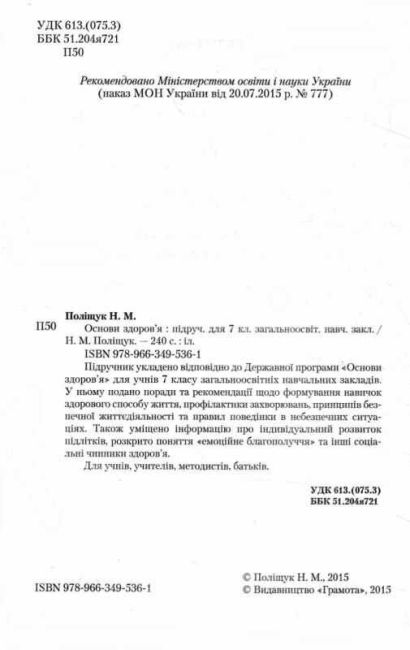 Підручник Основи здоров'я 7 клас Нова програма Авт: Н. М. Поліщук Вид-во: Грамота