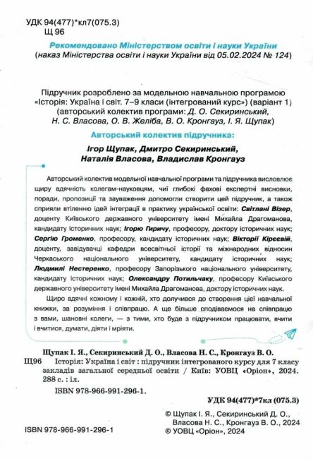 Підручник інтегрований курс Історія: Україна і світ 7 клас НУШ Авт: Щупак І.Я. та ін. Вид-во: Оріон 101680