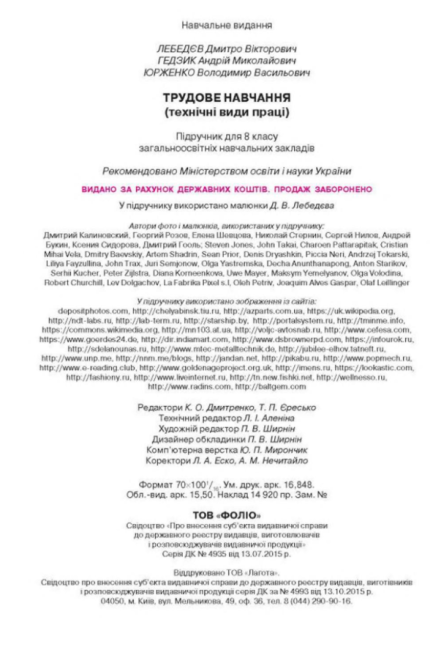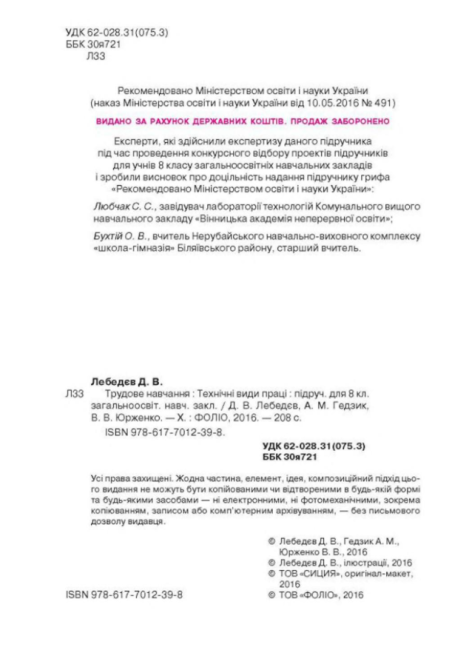 Підручник Трудове навчання Технічні види праці 8 клас Нова програма Авт: Лебедєв Д. Вид-во: Сиция 36449