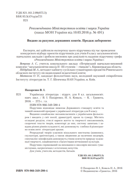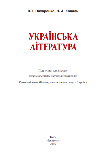 Підручник Українська література 8 клас Нова програма Авт: Пахаренко В. Коваль Н. Вид-во: Грамота 16101