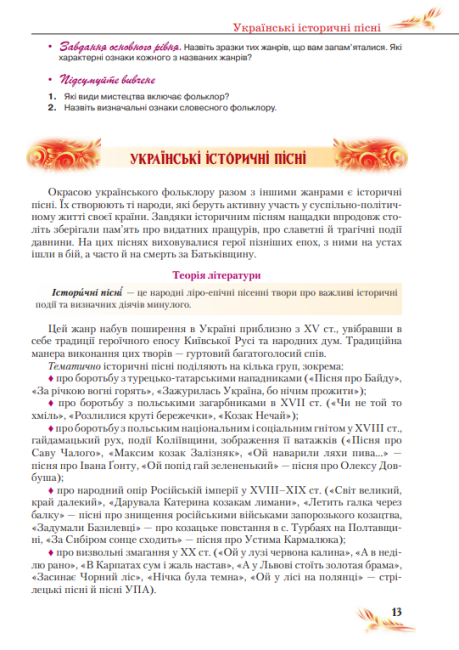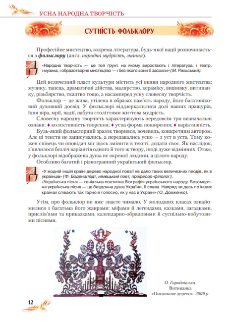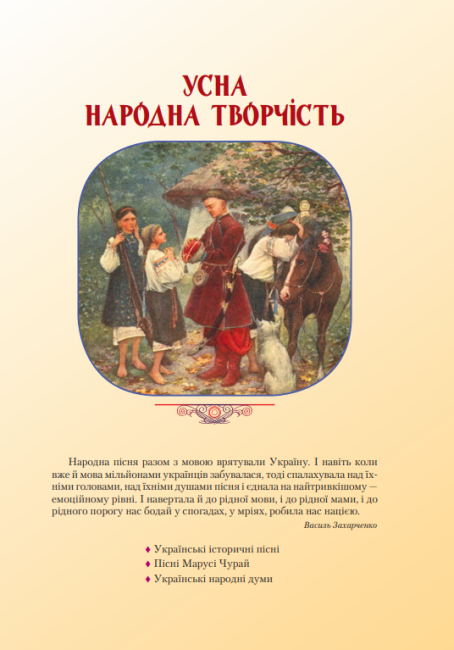 матеріали про український фольклор, які знайомлять із народними творами, піснями, казками та легендами, що є основою національної культури;