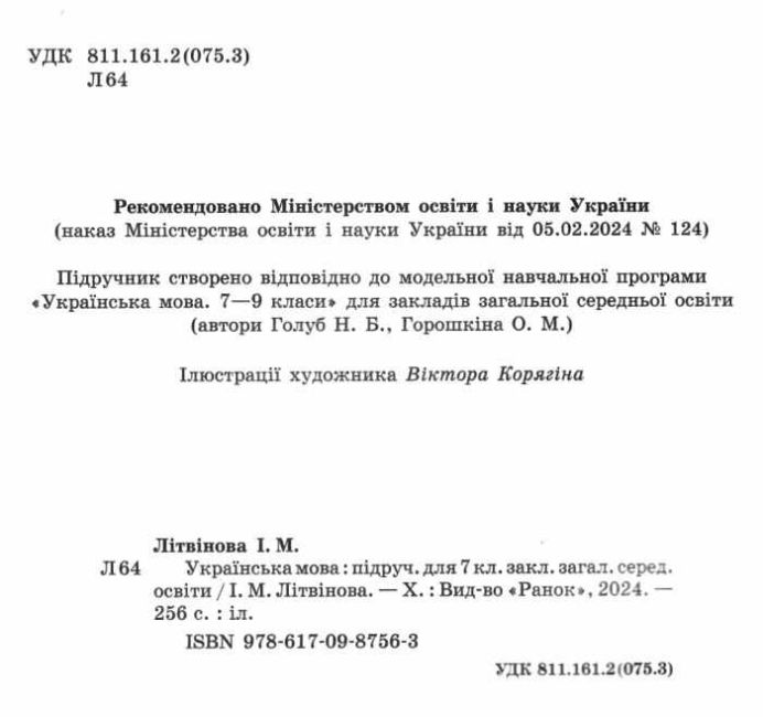 Підручник Українська мова 7 клас НУШ Авт: Літвінова І.М. Вид-во: Ранок 102269