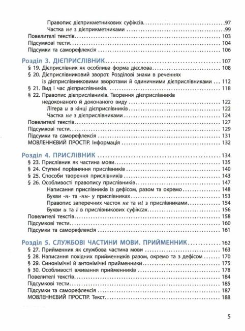 В основі підручника — збалансоване поєднання доступно викладеної нової інформації про мову із активним залученням уже здобутих знань і самостійних міркувань учнів та учениць. Вправи варіюються від простих на закріплення нових правил до творчих та дослідницьких. Тексти та завдання дібрані з увагою до зацікавлень відповідної вікової групи. У фокусі підручника — можливості практичного застосування здобутих знань у повсякденні. Видання призначене для учнівства та вчительства закладів загальної середньої освіти.